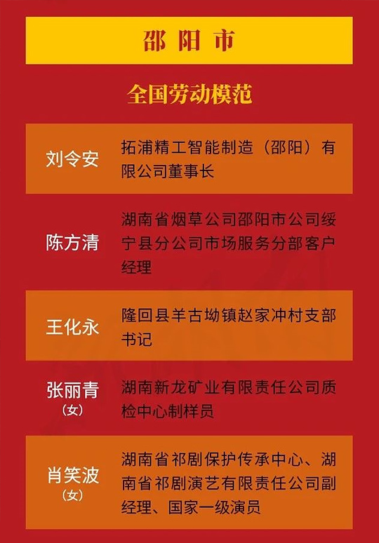 全国劳动模范(邵阳5人)全国先进工作者(邵阳1人)